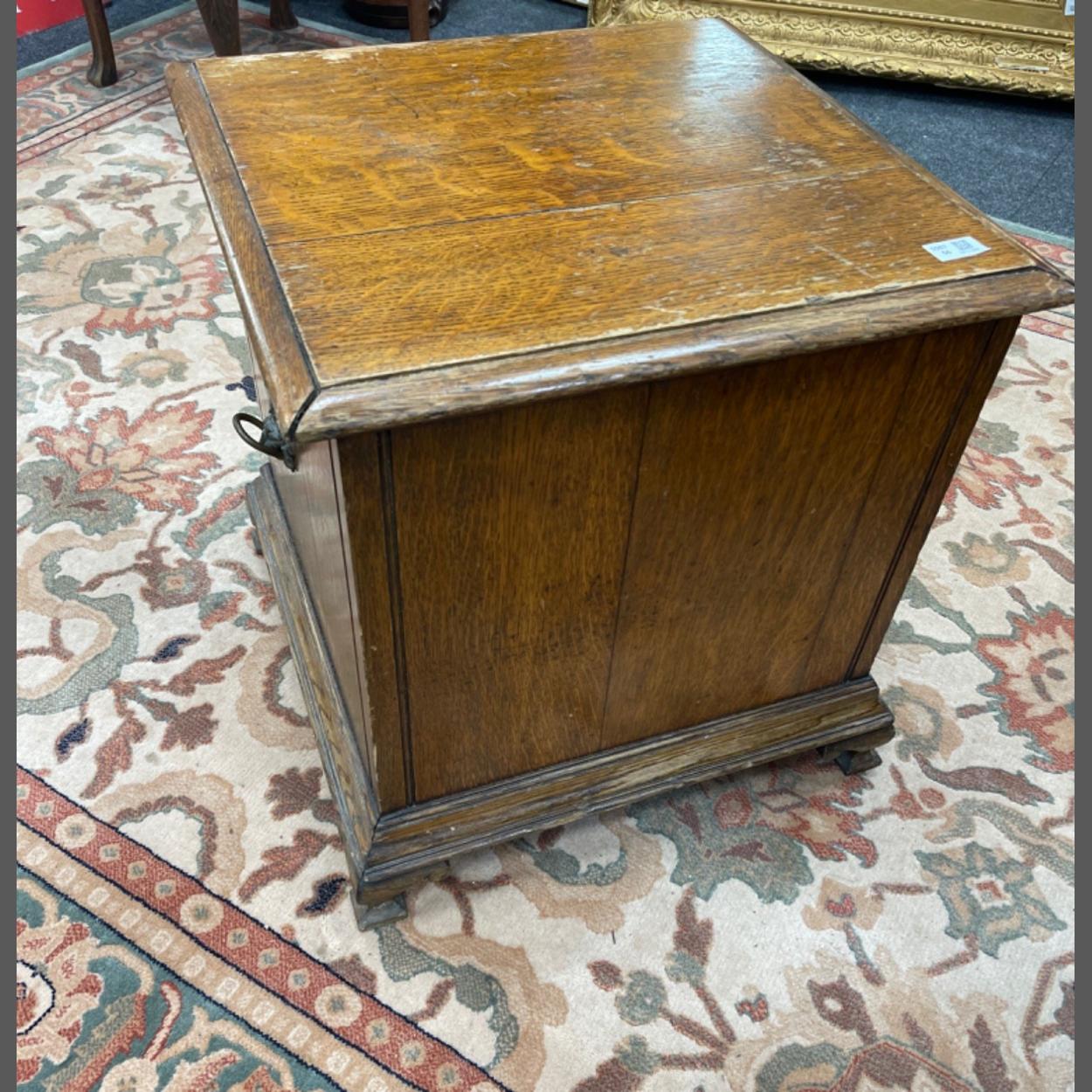 A lovely antique OAK LOG BOX with tin liner. Measures 52cm squared approx and with original lion head handles. Displays beautifully and potentially a useful storage box.