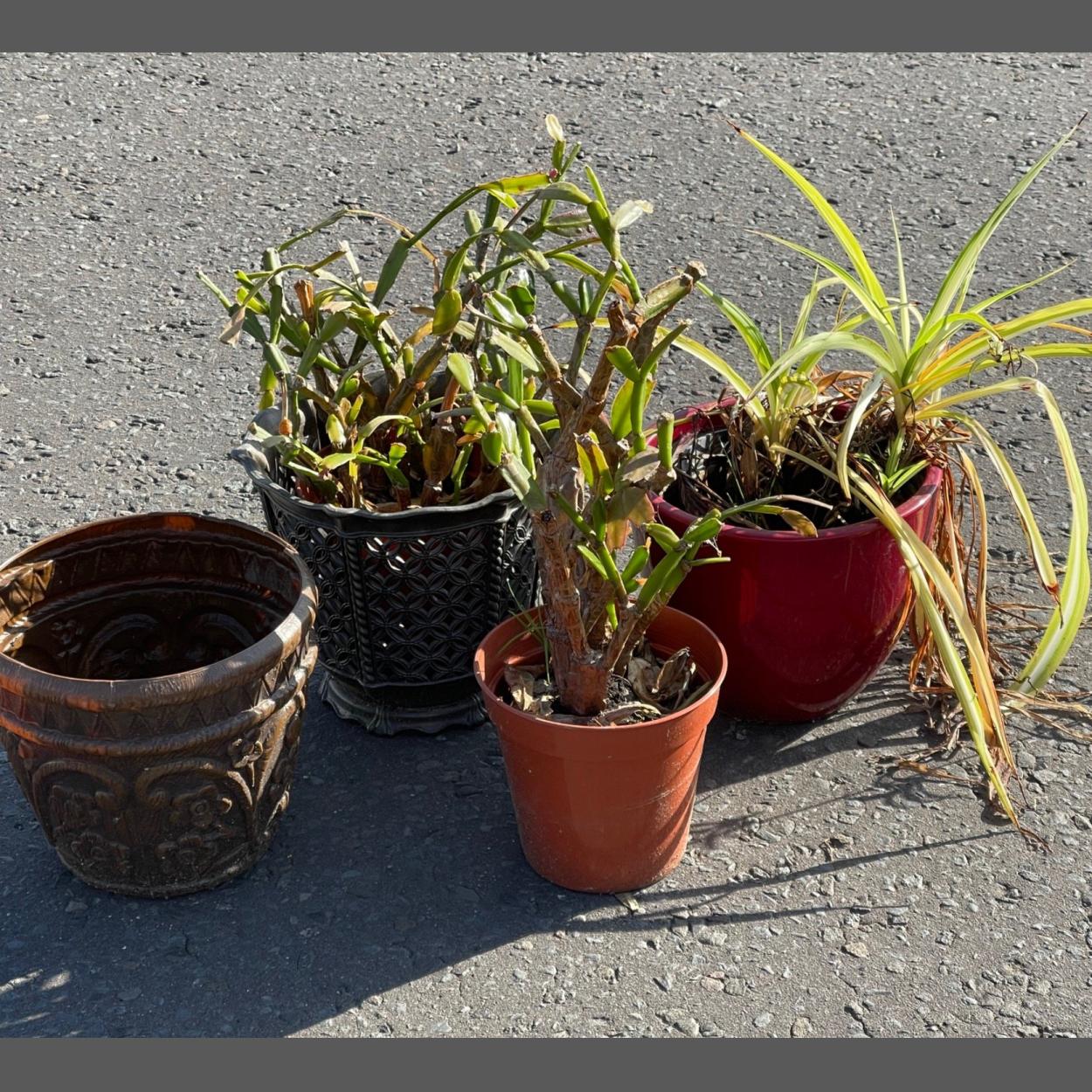Various HOUSEPLANTS in need of rescuing! - to include a spider plant, in a nice red ceramic pot, not one but TWO Easter/Xmas cacti (both around 20 years old I understand from the vendor!), one in a really nice pot and lastly a handy plastic plant container -