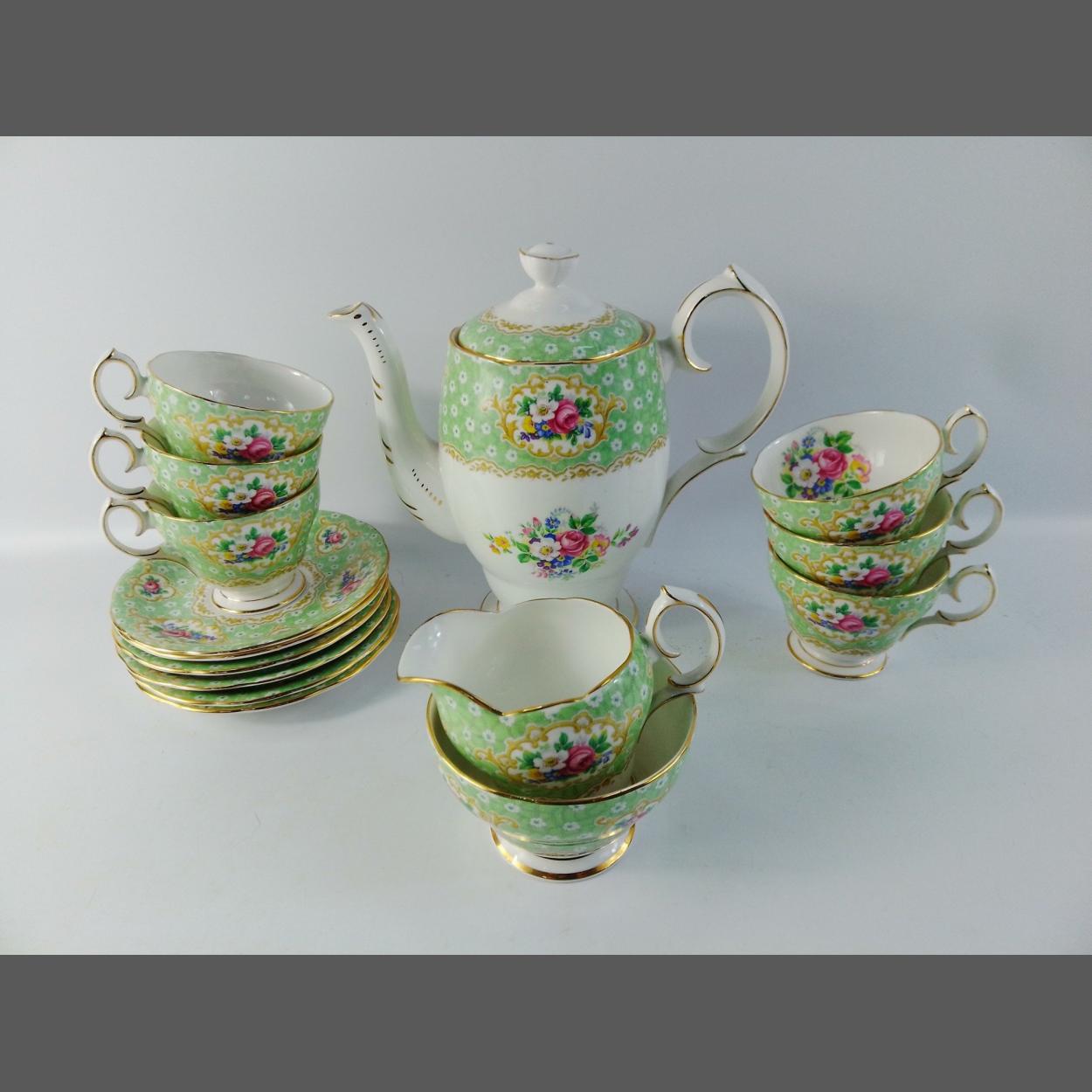 A QUEEN ANNE Gainsborough tea set comprising 6 cups and saucers, 1 teapot, 1 sugar bowl and 1 milk jug. No damage and no signs of wear.