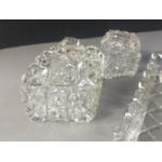 A cut glass dressing table set comprising a tray, three dishes, ring holder and a ceramic Wedgwood clementine pot. All in nice undamaged condition.