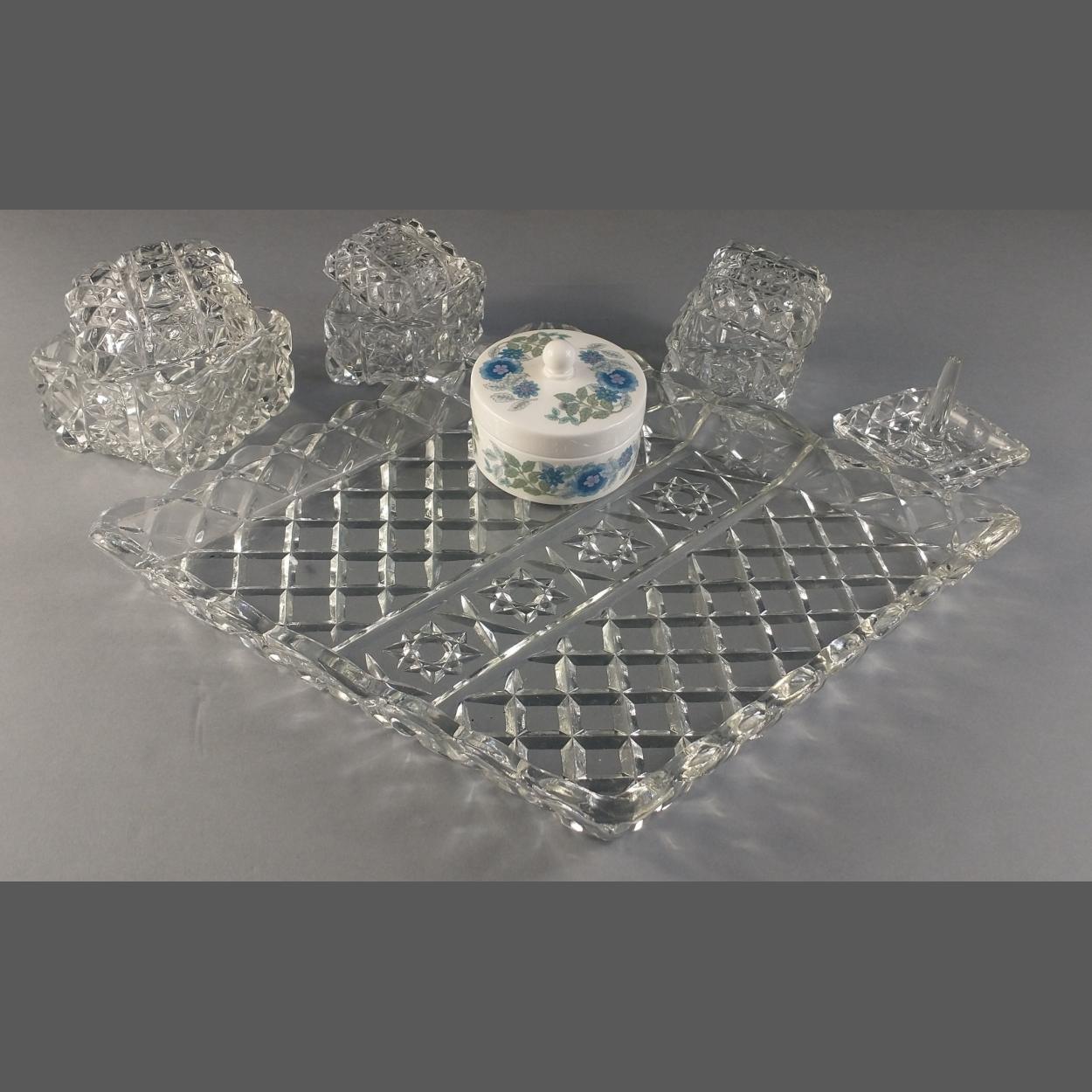 A cut glass dressing table set comprising a tray, three dishes, ring holder and a ceramic Wedgwood clementine pot. All in nice undamaged condition.