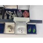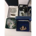 A mixed collection of costume jewellery to include a pewter seahorse, necklace and earrings sets, scarf clips, brooches etc