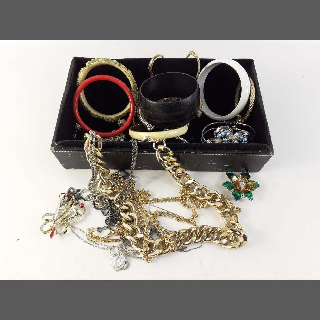 A black faux leather jewellery box (25x14x8cm approx) filled with chunky bangles and chains (box slightly scuffed)