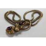 VINTAGE! An unmarked yellow metal necklace with unusual fish pendant and two oval red stones. Gross weight is 19.38g. approx