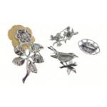 A collection of 4 pin brooches to include one floral and one red robin etc.