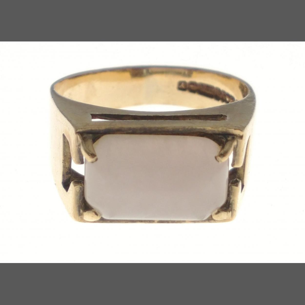 A gold ring with a white / pink stone. Full 375 hallmarks. Total gross weight 3.95g approx.
