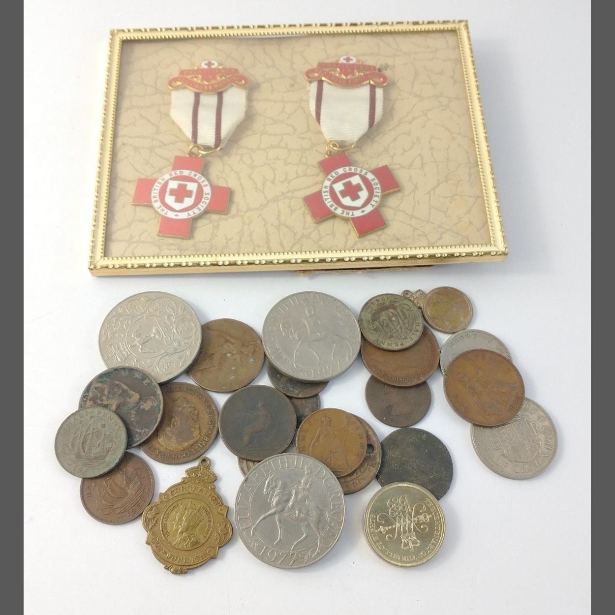 A GEORGE V commemorative medallion with a quantity of old coinage to include Jubilee coins 1977 etc. and a pretty little frame with two Red Cross Nursing Proficiency medals