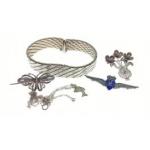 A small collection of silver jewellery items to include crowned wing enamel brooch, an Egyptian style pendant on a 925 marked chain, a 925 bracelet band and two pretty filigree brooches. Total gross weight 41.3g