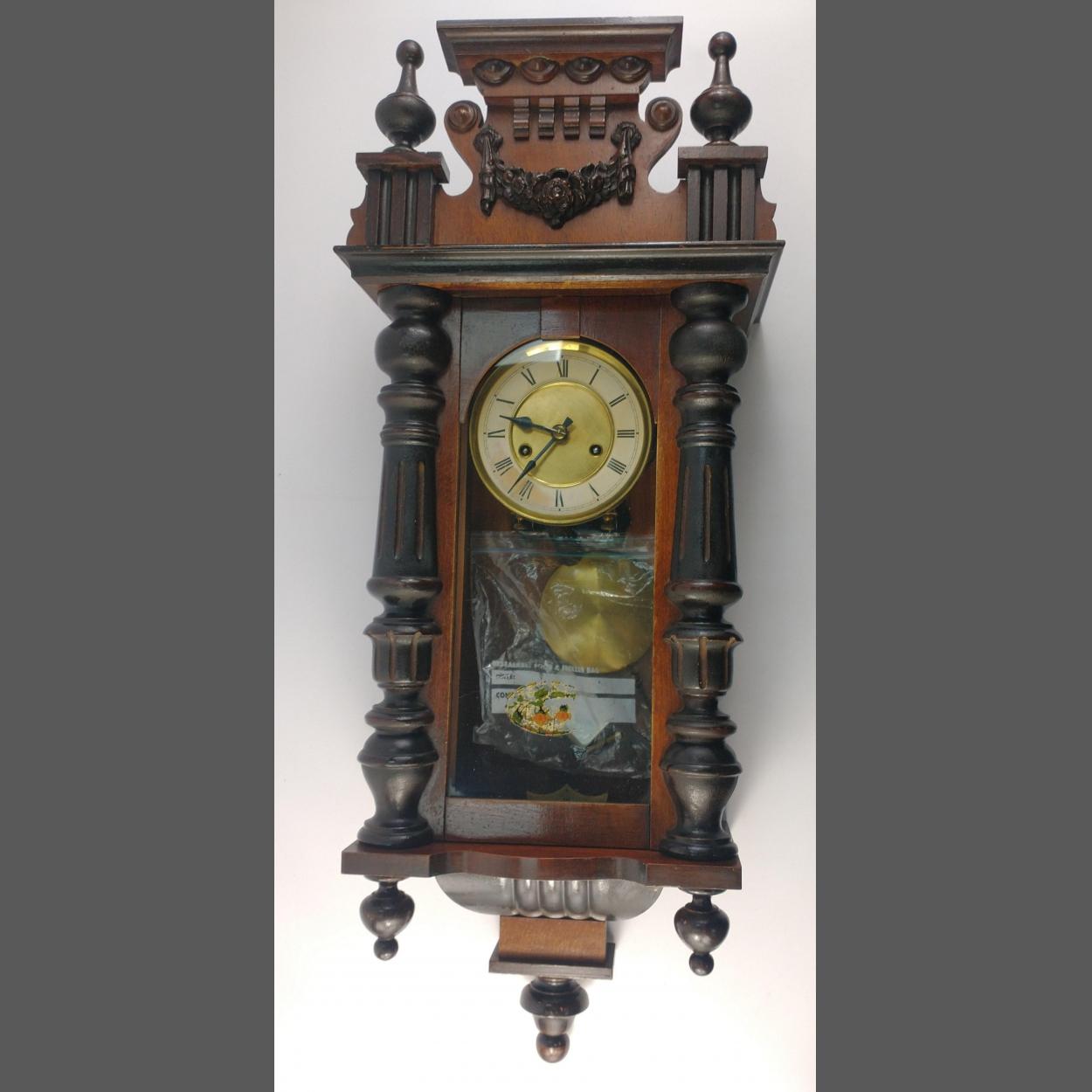 An early twentieth century wall clock with key and pendulum. Top pediment is removeable. Measures 82cm tall.