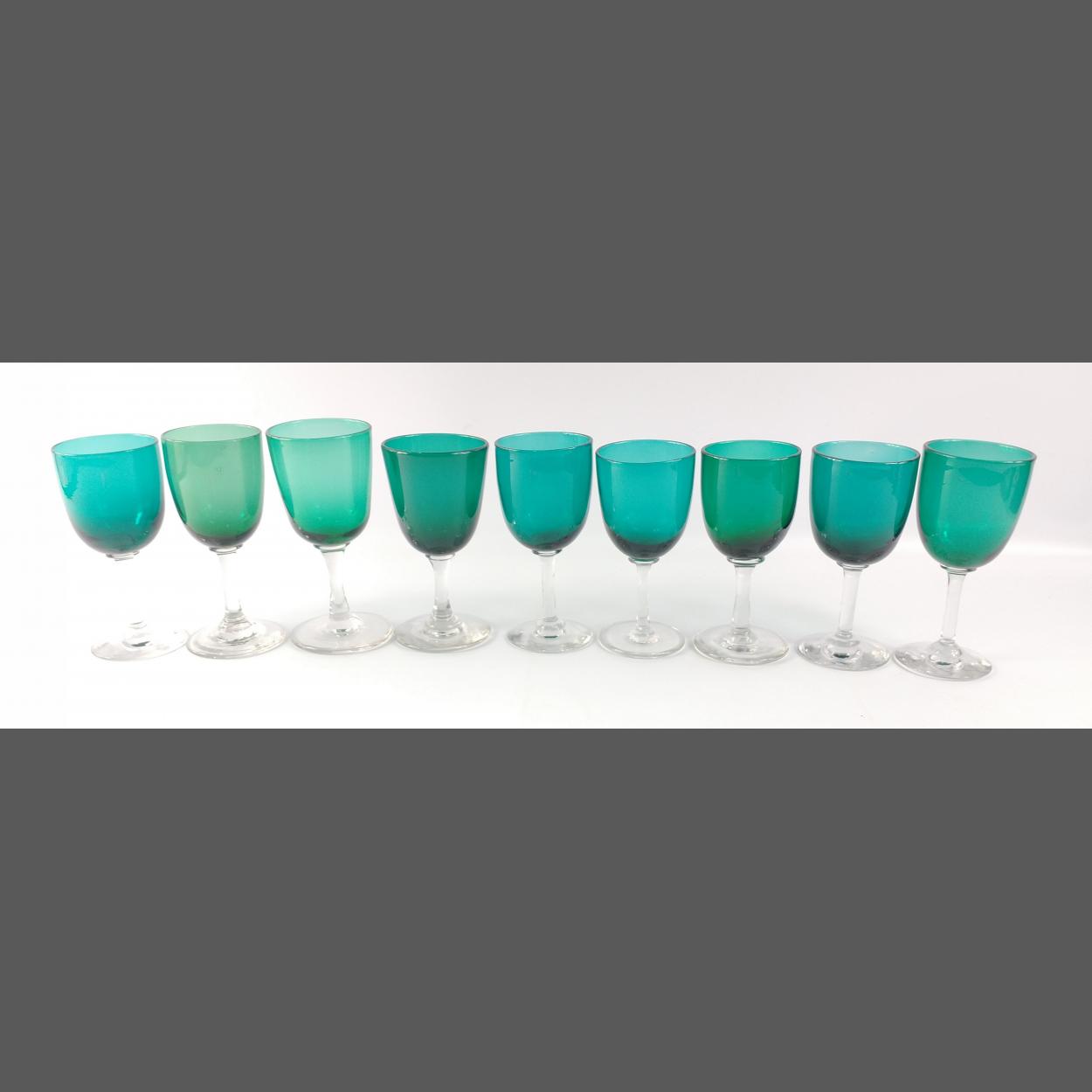 Nine stemmed wine glasses in attractive green glass each 13cm high approx. All in good undamaged condition.
