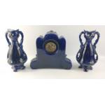 A Victorian cobalt blue porcelain mantle clock with matching vases with gilding and hand painted panels. The clock centerpiece stands 24cm high and all pieces are in overall good condition. By JOSEF STRANCT of Austria. Missing the rear of the movement.