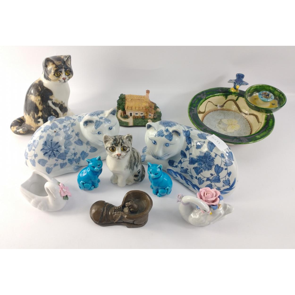 A Purrrrrrretty little lot of ceramic pussy cats and others. Includes a very pretty pair of pottery blue and whites.