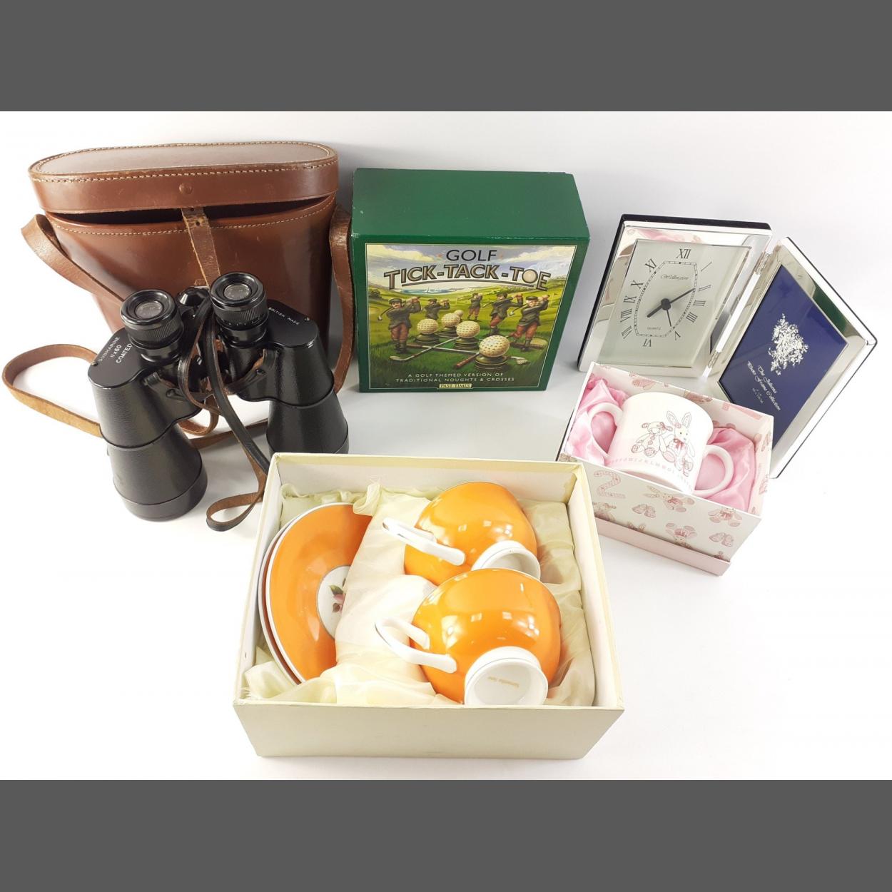 A mixed lot to include a boxed golf game, a set of binoculars in a case A/F, a silver plated photo frame clock, a boxed Samantha Jane tea cup set and a child's drinking mug christening gift.