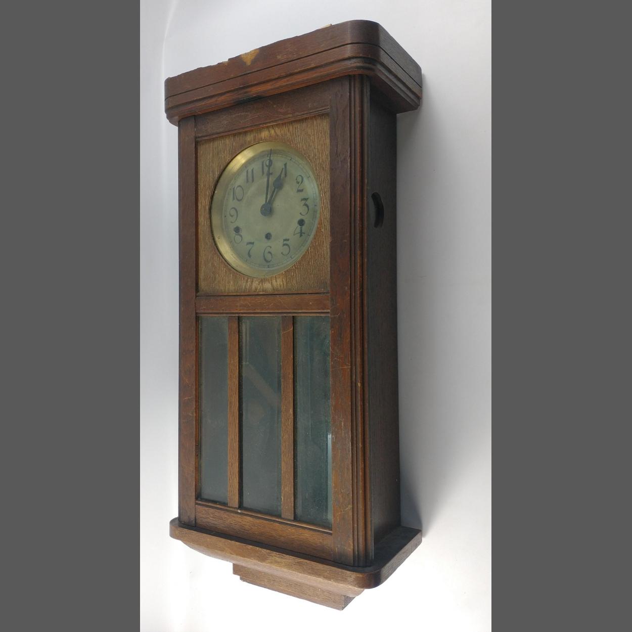 An antique wooden wall clock measuring 75cm tall approx complete with pendulum. Needs a little TLC.