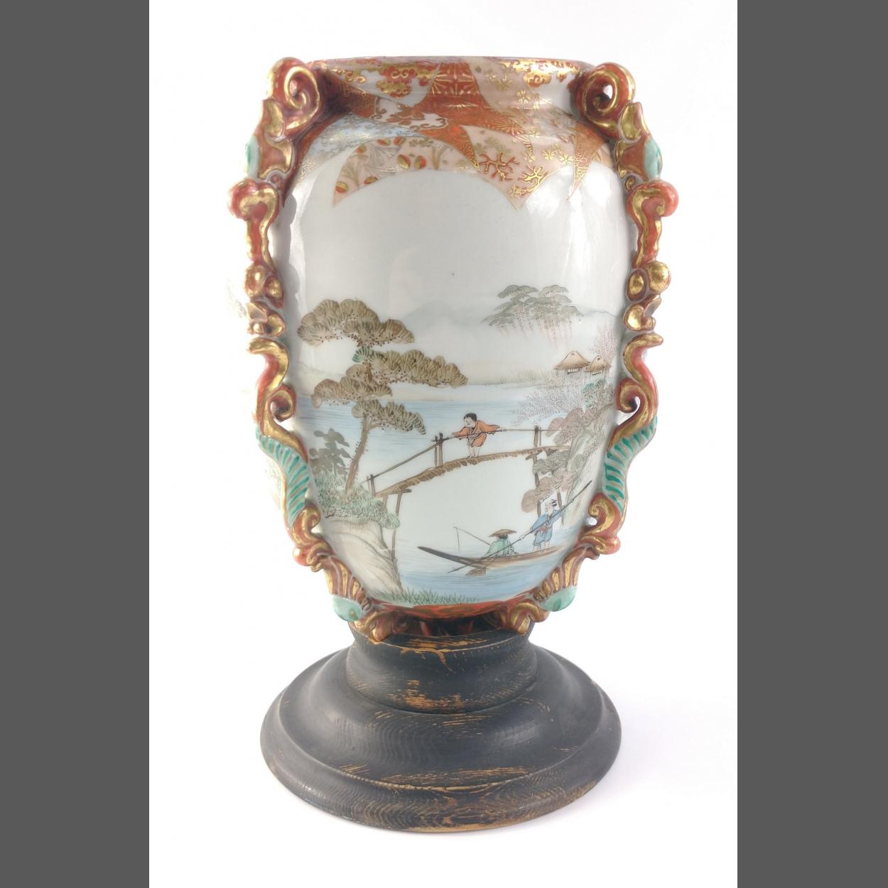 A substantial decorated urn style Japanese vase on wooden stand. Stands 30cm tall on plinth.