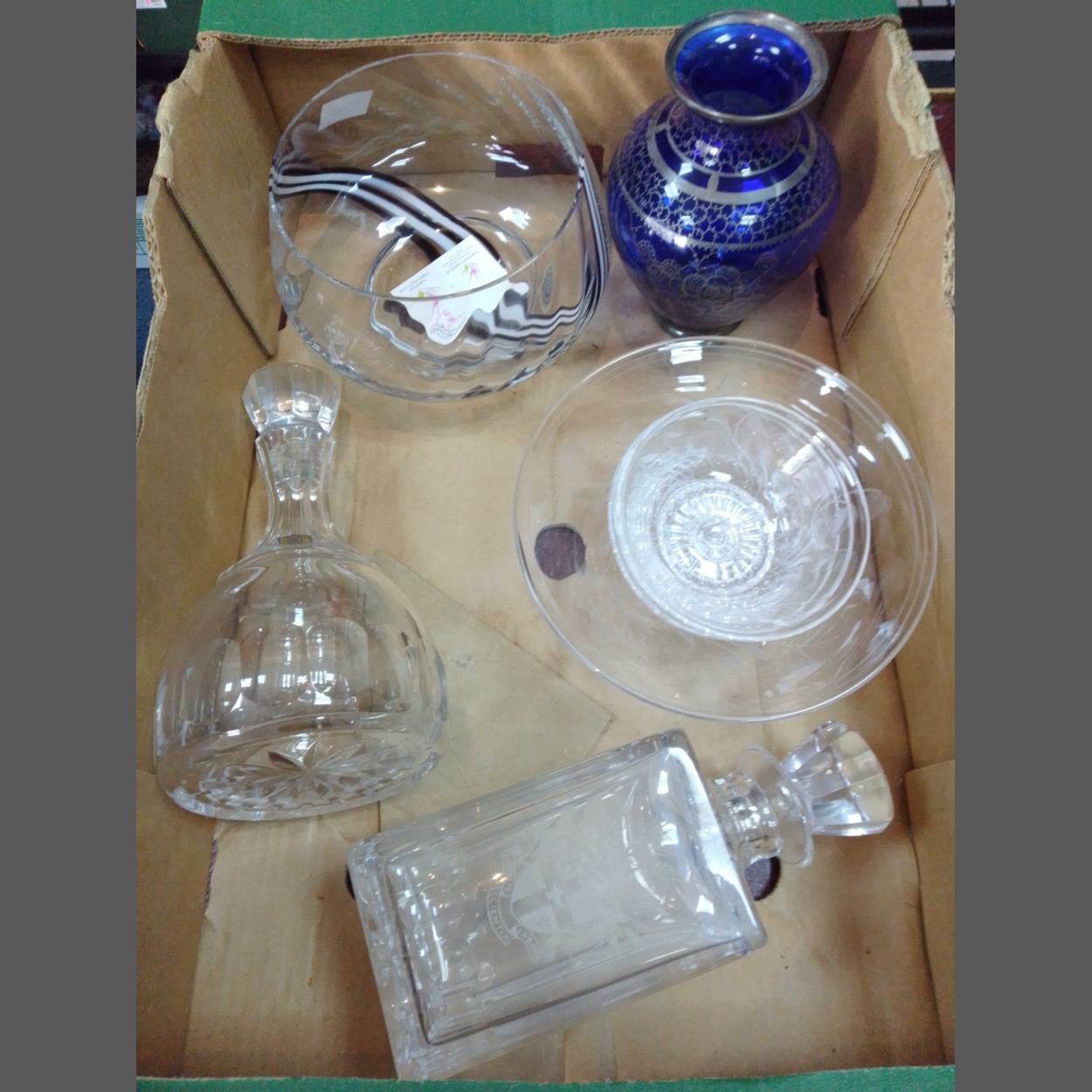 A mixed lot of attractive glass items to include one square decanter with engraved crest measuring approx. 24cmH, a round-based cut glass decanter with engraved crest measuring approx. 25cmH, an engraved Stuart England bowl measuring approx. 22cm dia together with 3 smaller bowls measuring approx. 13cm dia, a beautiful classically shaped blue glass vase decoratively painted in dull silver metal and a stylish CAITHNESS CRYSTAL bowl measuring approx. 18cm dia.