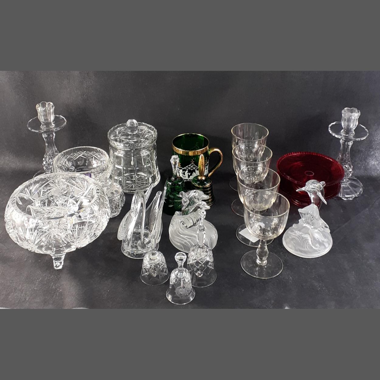 A box of useful glassware to include two cranberry coloured dishes, an EDINBURGH CRYSTAL classical bowl and various others.