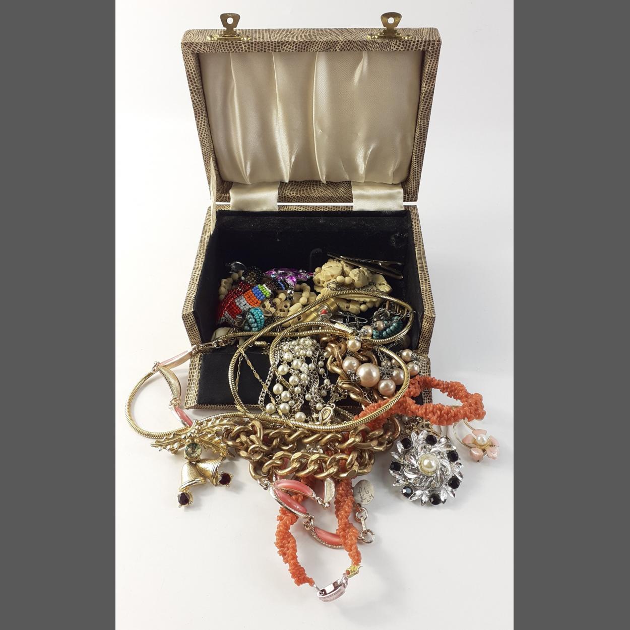 A small jewellery box with a dop-down front and snake-style covering with contents of stylish costume jewellery