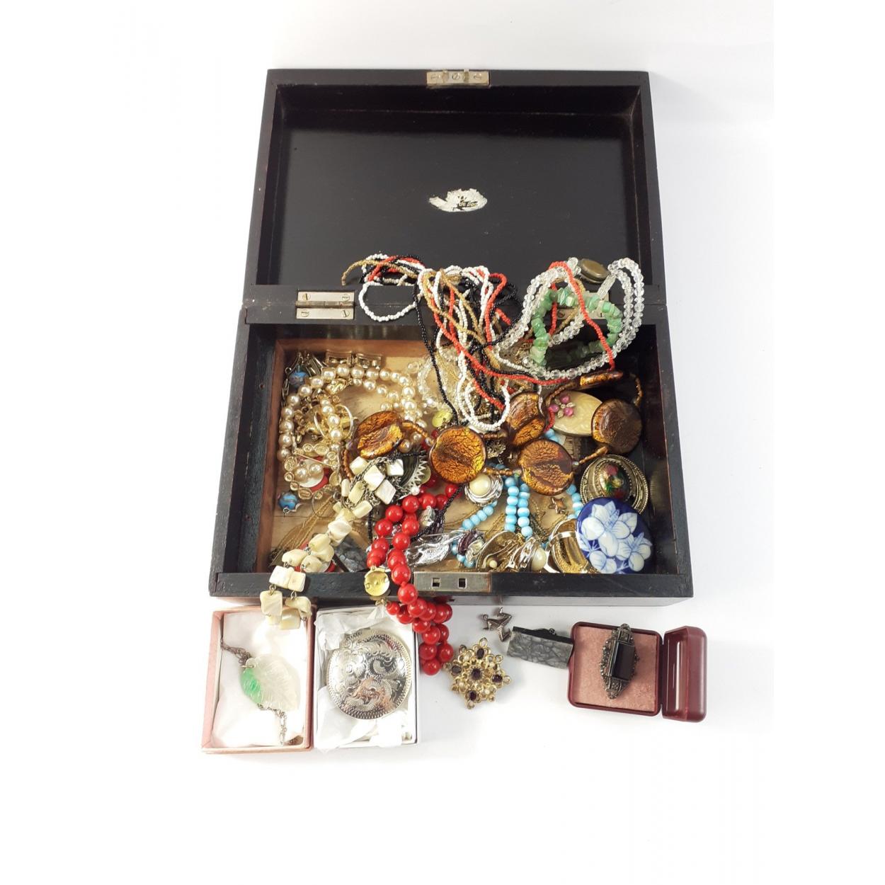 A dark wood jewellery box 24x16x8cm with contents including crystal beads, clip-on earrings etc