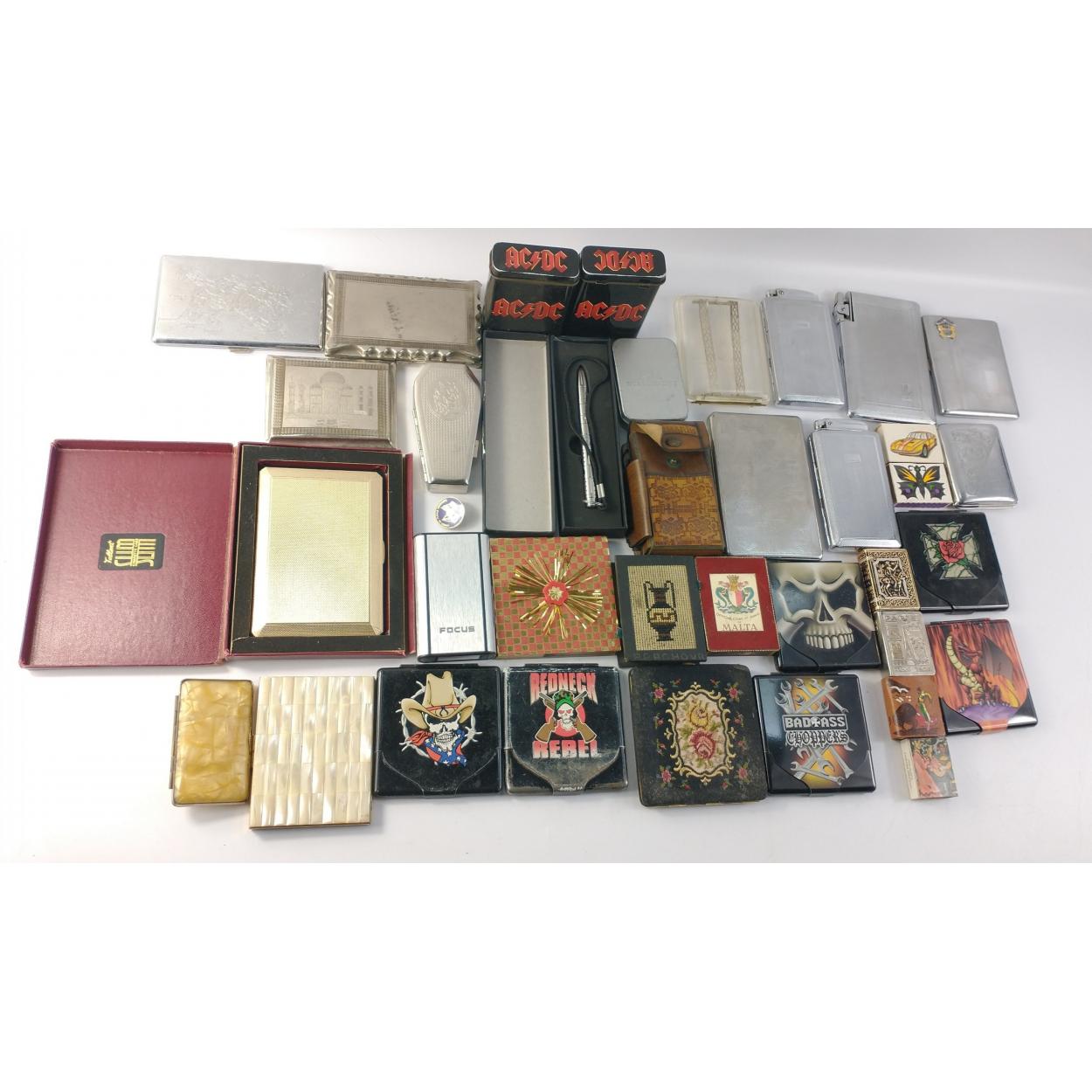 A large quantity of base metal and novelty cigarette cases including ones with etched maps of Jersey, Taj Mahal, India, Scotland and much else.