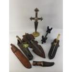 A collection of ornamental daggers, several with display stands to include one commemorating the Spitfire, one with wolves in a snowy scene, a BOWIE knife inscribed "Siege of the Alamo 1836, Col. Jim Bowie's Last Stand" in a leather scabbard, and others