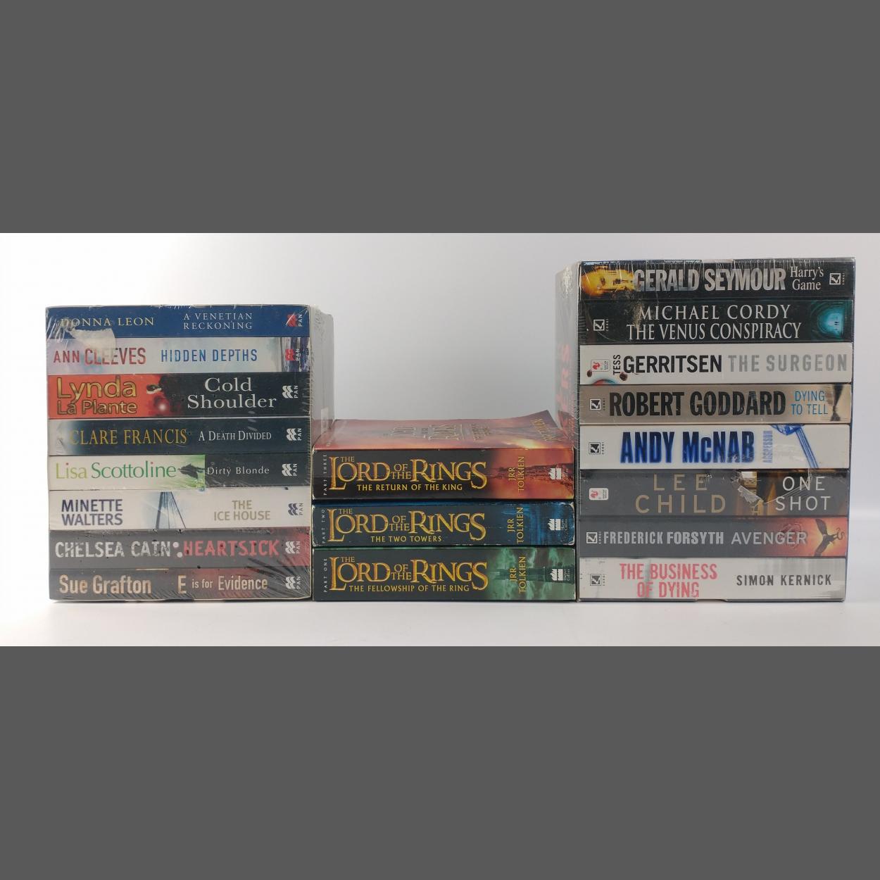 An opportunity to discover new authors with these two sealed boxed sets of books - MURDER SHE WROTE (RRP £55.92), 8 titles by female authors including Ann Cleeves (Shetland and Vera) and Lynda La Plante (Tennison), plus THRILLER SEEKERS (RRP £60.92), 8 titles by Lee Child (Jack Reacher), Tess Gerritsen (Rizzoli & Isles) etc plus the evergreen LORD OF THE RINGS by JRR Tolkien in three volumes