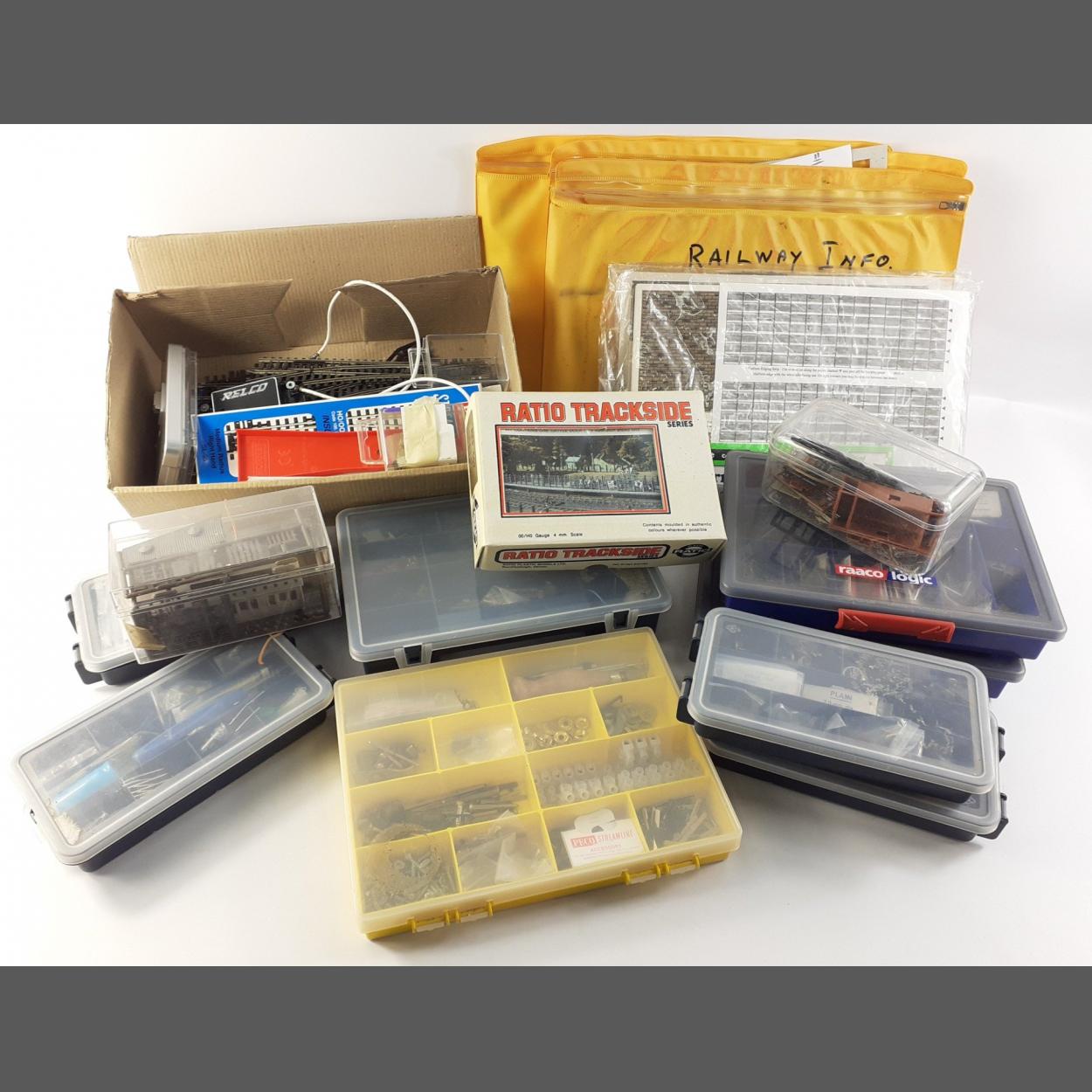 A selection of HO/OO model rail layout track and a selection of points, bogies, and useful tooling for the model railway enthusiast. Includes some magazines