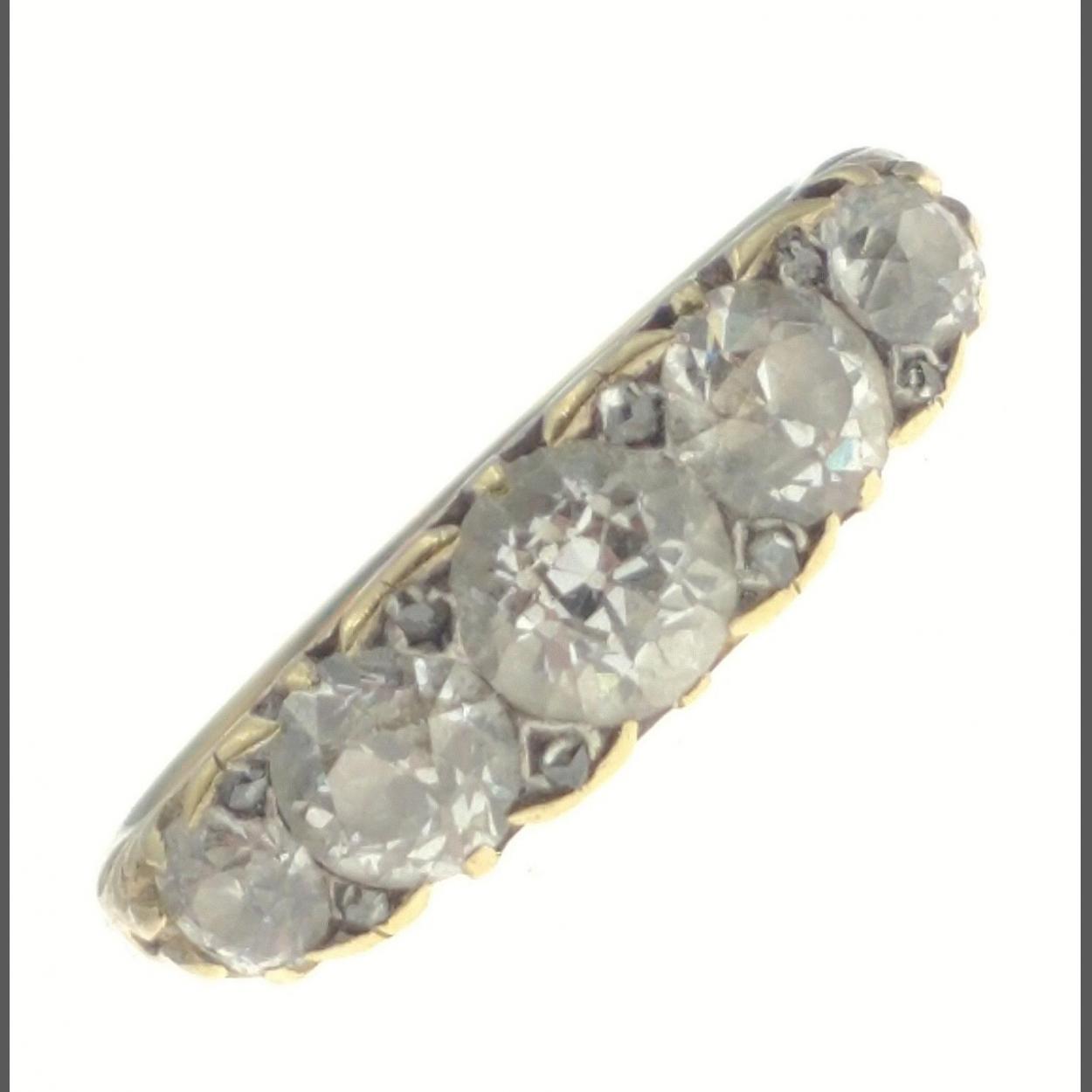 An unmarked yellow metal ring with elaborate shoulder design with 5 mid-cut substantial clear stones tested as diamonds, largest stone 4mm approx plus 2 x 3mm and 2 x 2mm diameter, size N, gross weight 4.0g approx
