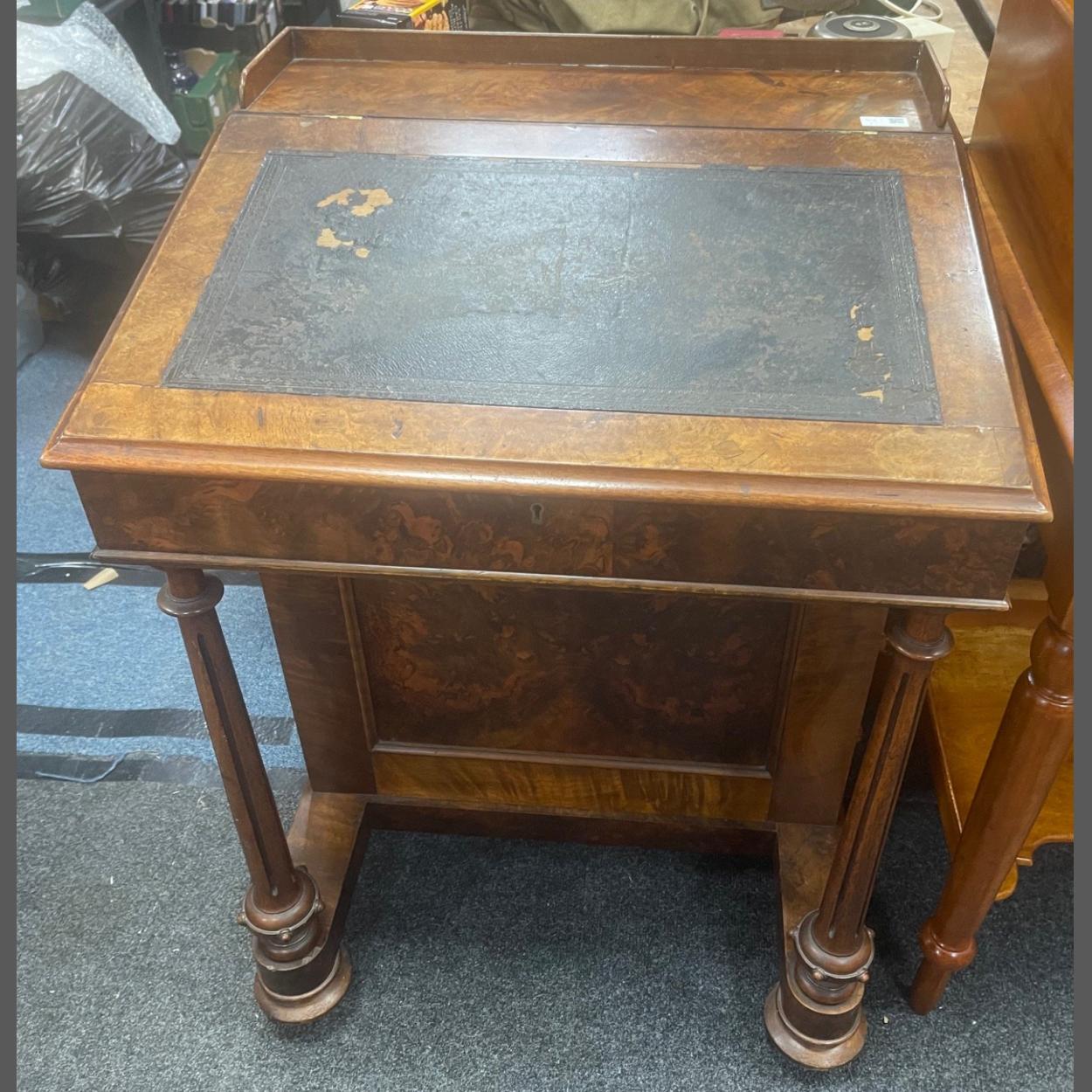 A fine quality antique DAVENPORT with WALNUT veneer to include 8 side drawers and a worn leather writing slope with a key - to include a secret compartment drawer Measures 63cmW x 57cmD x 88cmH