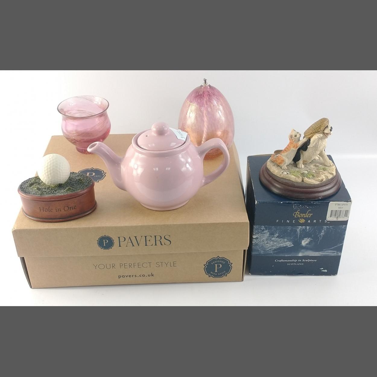 A mixed box to include a boxed BORDER FINE ARTS model (RR07) 'If the Cap Fits', a HISTORY CRAFT (A1612) Hole in One trinket box, a pink PRICE KENSINGTON teapot for one and 2 pieces of cranberry and gilt glassware