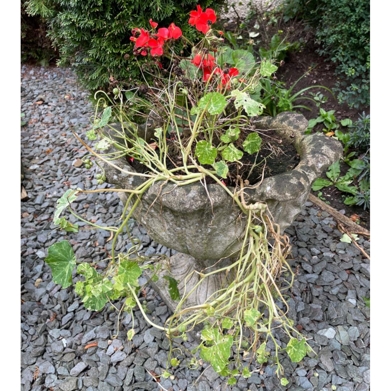 One of a pair of stone-effect floor standing garden urns standing 35cm tall x 40cm diameter approx - comes in 2 pieces for ease of transport etc - comes complete with planting of geraniums etc