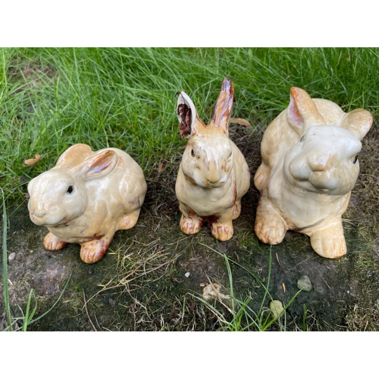 MRS HARE, THUMPER and TRIXIE ceramic glazed style garden ornamental bunnies - one of the items has a chip off one of its ears - tallest 20cm approx