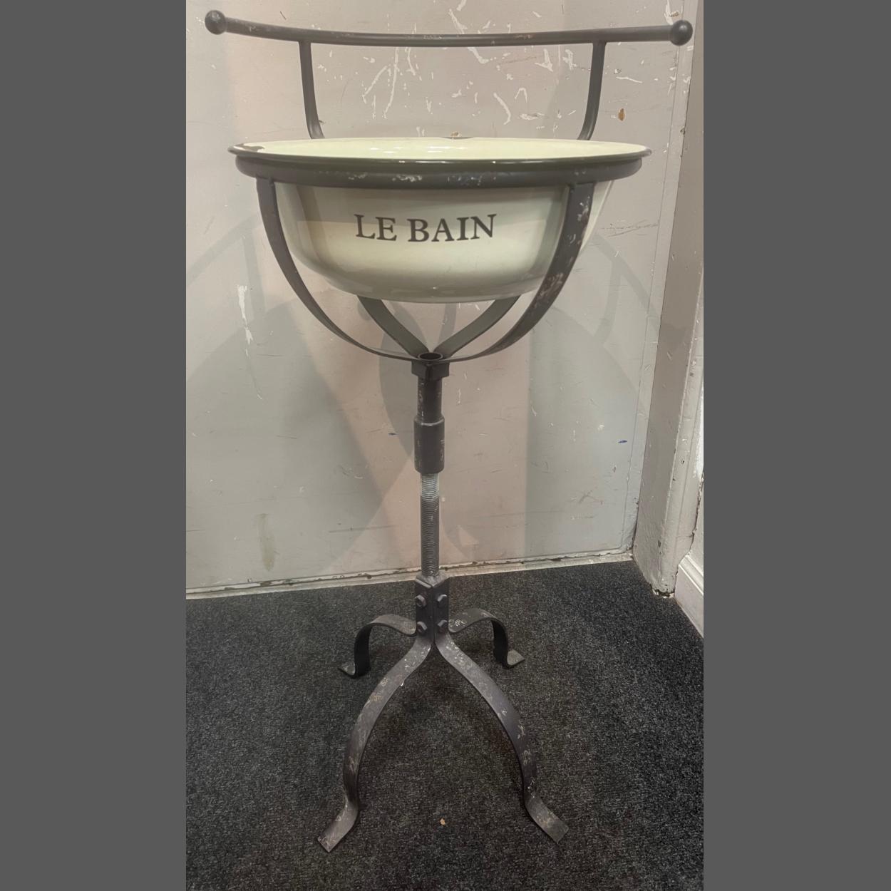LE BAIN enamel wash basin on wrought iron stand. A great look and a super decorator's item - dimensions 82cm height x 36cm diameter
