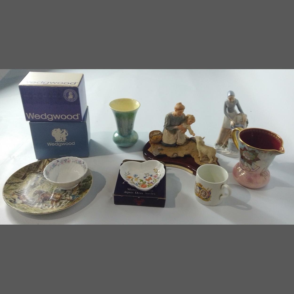 A mixed lot to include Sherratt & Simpson cute figure group entitled April Morning, a figurine in the style of Nao, a SYLVAC vase 674, highly decorated CARLTON WARE jug, a 1937 Coronation cup and several boxes of WEDGWOOD decorative china