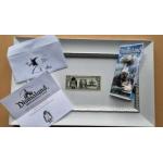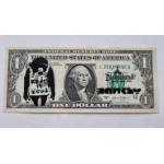 A framed stencilled DISMALAND real One Dollar bill stamped with the BANKSY chomp along with a stencilled image. Dismaland was a temporary art project that took place during the months of August and September 2015 taking the form of an amusement park. Created by English artist Banksy, it is located in the seaside resort of Weston-super-Mare, England, on the site of a former recreation area. These items were strewn in the park, visitors finding them could leave with them. Part of a private Banksy Dismaland collection. The copies shown of Ephemera will accompany the piece free of charge. Pest Control the only official body for authentication of Banksy does not authenticate any items of free art from the Dismaland project but despite this these free art items still seem to have a great collectors following. . H: 36cm W: 59cm D: 2cm