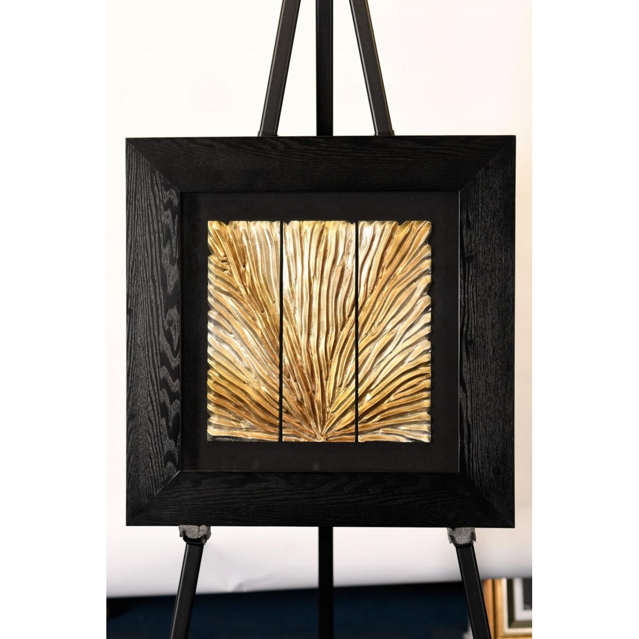 A modern framed art with a gold & silver coloured hand carved wooden panel which has been set into the frame.. H: 70cm W: 70cm D: 4cm