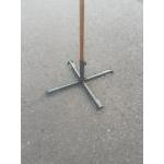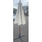 A POSH cream cotton garden self-winding PARASOL with a connecting standing base tool (required to weigh down etc) or simply erect through the table etc - stands 7ft tall with a 6ft diameter approx