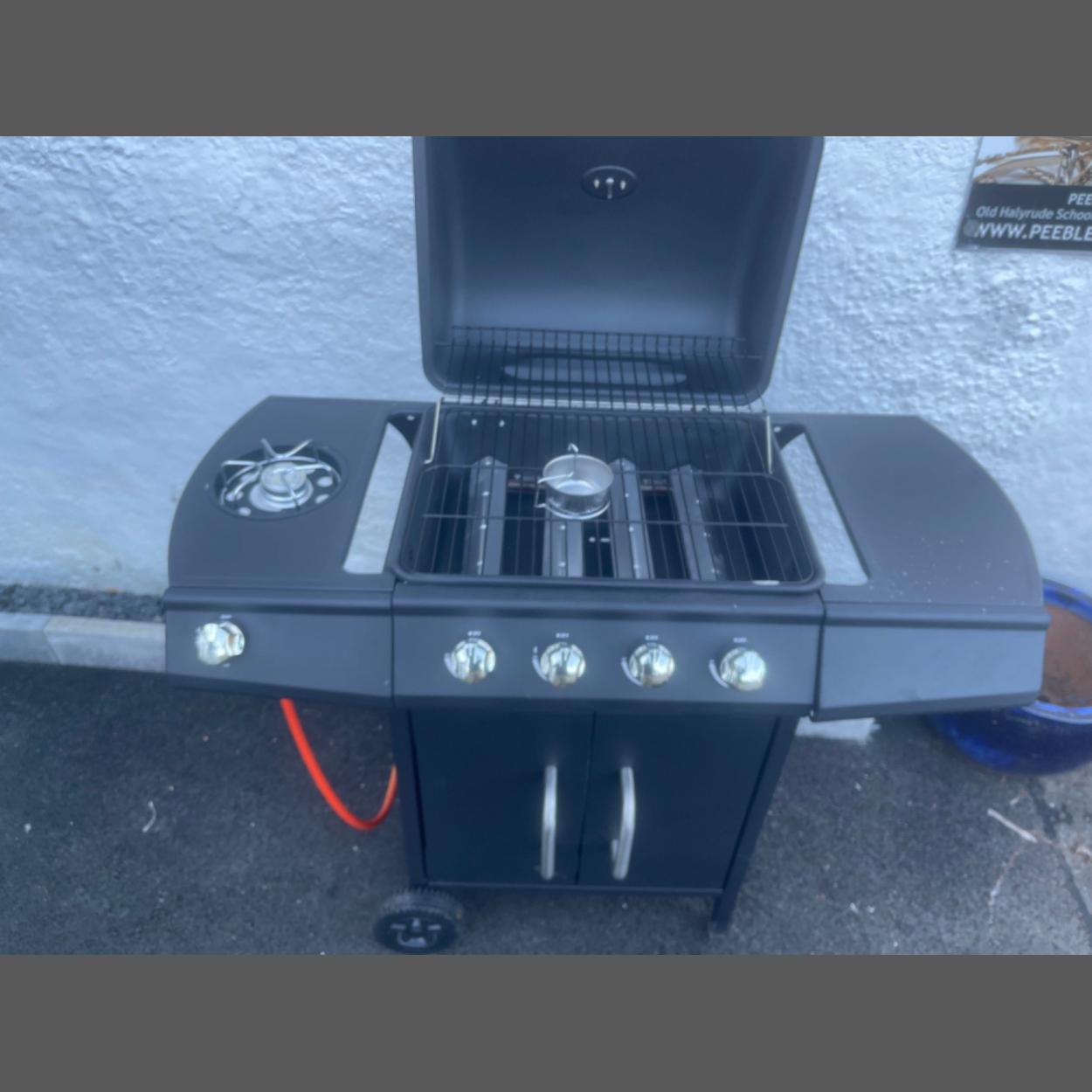 FRYING TONIGHT! A BRAND NEW UNUSED 4 burner GAS BBQ - requires a couple of screws to secure the two handles but other than that good to go! This bbq also comes with a fitted all-weather waterproof cover