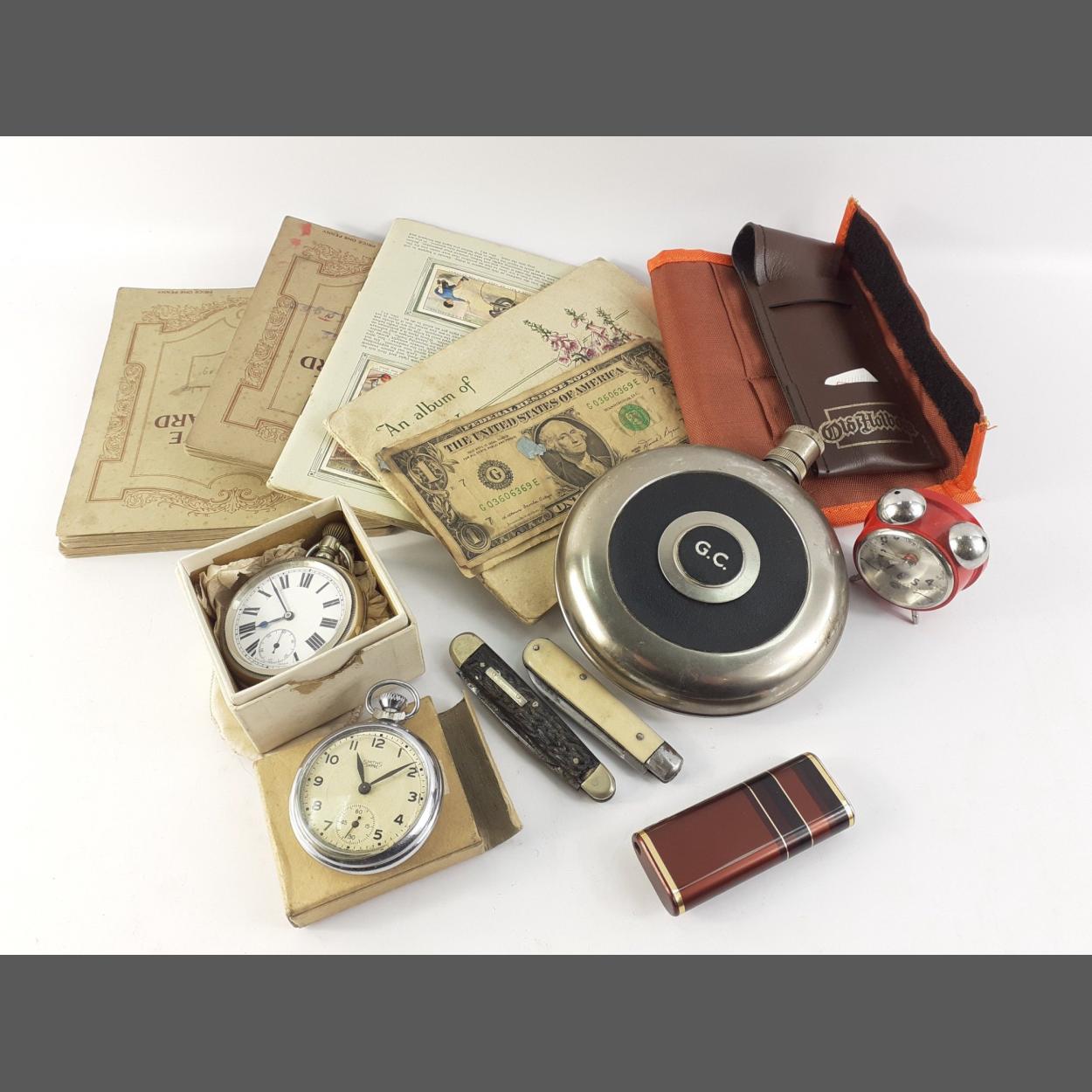 A mixed lot to include some cigarette card albums, a hip flask, two pocket watches, a lighter, a set of darts and a couple of pen knives.