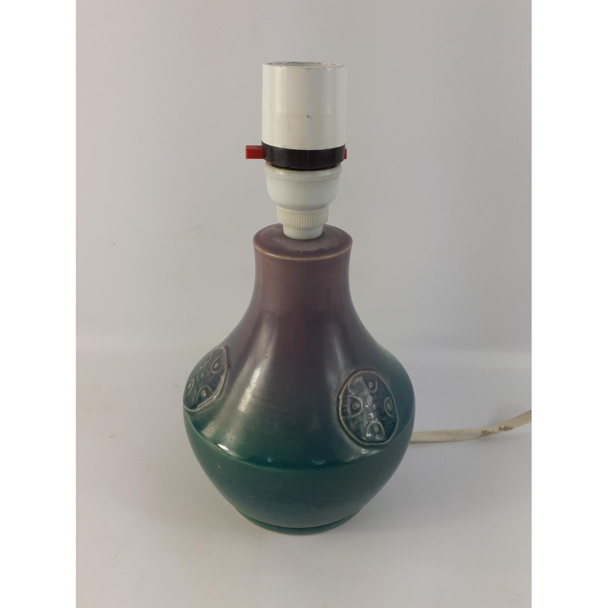 PEEBLES POTTERY. A very nice small pottery lamp base with attractive purple green colour and Celtic twist motifs. Stands 15cm excluding the lamp fitting. An unusual piece of local interest.