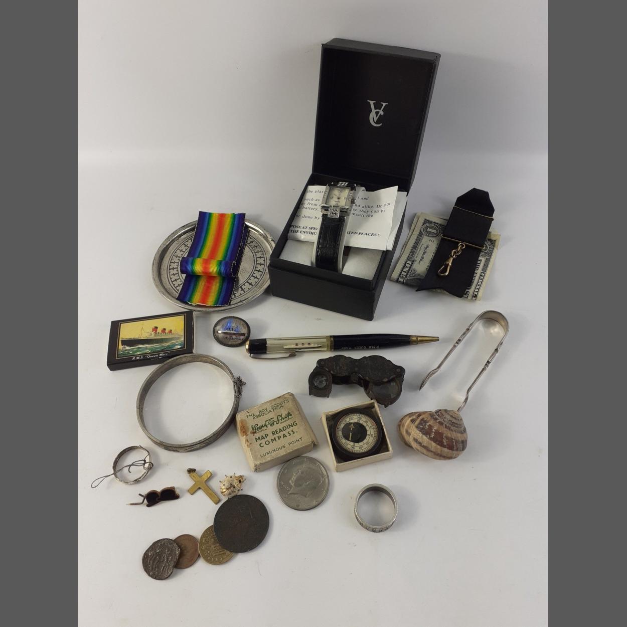 Mixed lot to include boxed VC laies quartz watch (needs battery), wooden jewellers loupe, varoius plated items, a map compass etc.