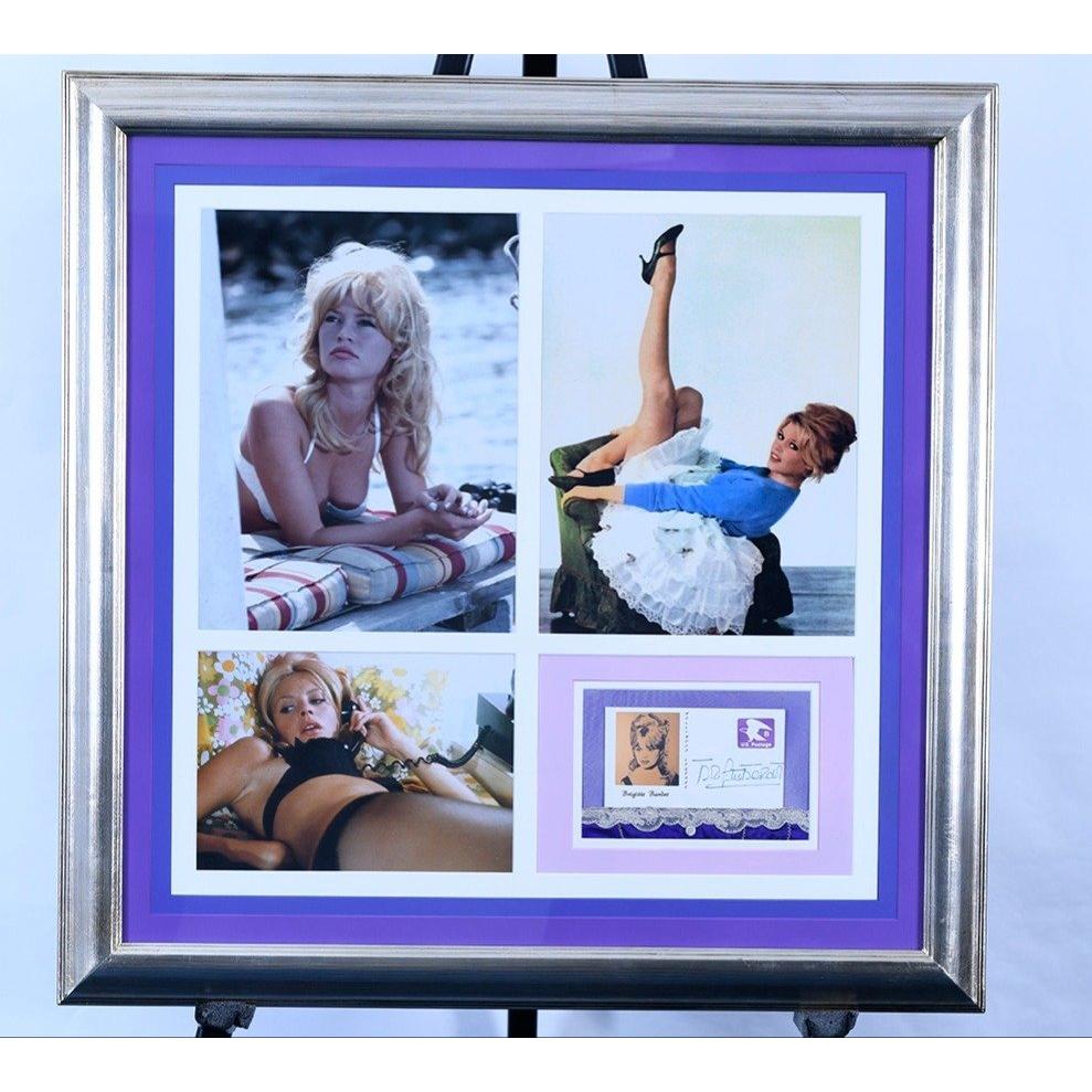 This framed BRIGITTE BARDOT memorabilia presentation features the famous Hollywood legends original authenticated signature. Very nicely framed and lovely detailing with the mount presentation. Note: this item will be supplied with a certificate of authenticity (free of charge). H: 86cm W: 86cm D: 3cm