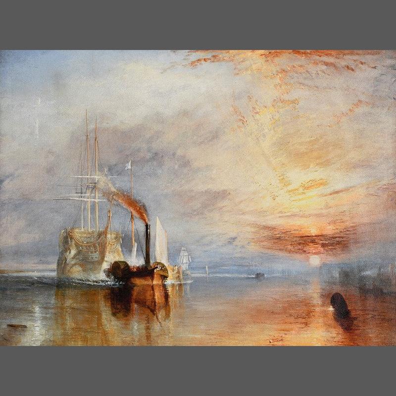 A limited edition on canvas of J.M.W. TURNER's "Fighting Temeraire" from a sold out published edition of only 60 on canvas Worldwide. It will be supplied with an a replacement valuation certificate for £1500 (free of charge). The quality of this print is of the highest standard, please see photographs which actually pick up the cracking in the paint from the original. Condition is excellent. Please note that the full title is `The Fighting Temeraire Tugged to her Last Birth to be Broken-up, 1838` The original painting was produced in 1839. Turner`s elegy for the age of sail and British Oak embodied in seamen, man-of-war and ships of the line, also ushers in the steam age. Sold like other outdated war ships for the price of her timber, the Temeraire is towed to the breakers by a steam tug. Much later, Turner`s picture was described as his first, almost prophetic idea of smoke, soot, iron and steam. Turner called it his `darling` and refused to sell it. He intended it for the National Gallery which sits in Trafalgar Square named after the battle in which the Temeraire had served and to this day the painting remains in the collection of the National Gallery.. H: 76cm W: 101cm D: 1cm