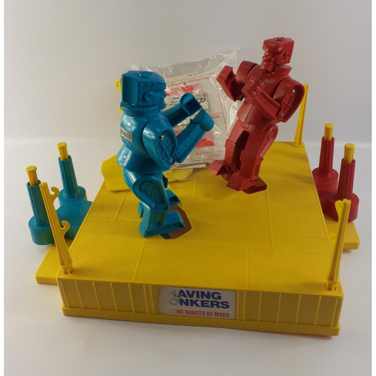 1970s MARX TOYS. RAVING BONKERS FIGHTING ROBOTS. Appears complete and in good condition even with the instructions, score card and the ropes.