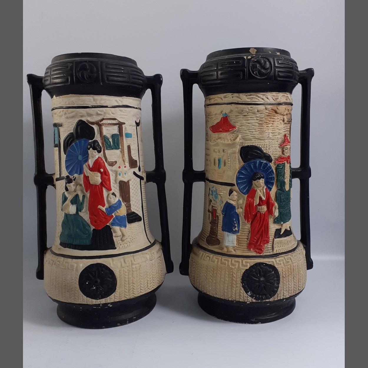 A pair of CYPLES OLD POTTERY Embosa ware vases (179 reg. no 748574) with geisha decoration, standing 28cm high approx, some small chips on both pieces