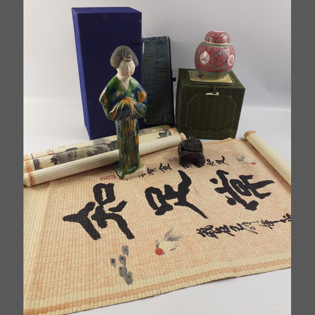 A lovely elaborately boxed famille rose ginger jar 10cm high (no damage), a boxed part-glazed pottery lady in a kimono standing 24cm high, no damage, a carved wooden frog maybe a pen holder, 6cm high, two bamboo scrolls one with calligraphy, the other a mountain scene 80x32cm,