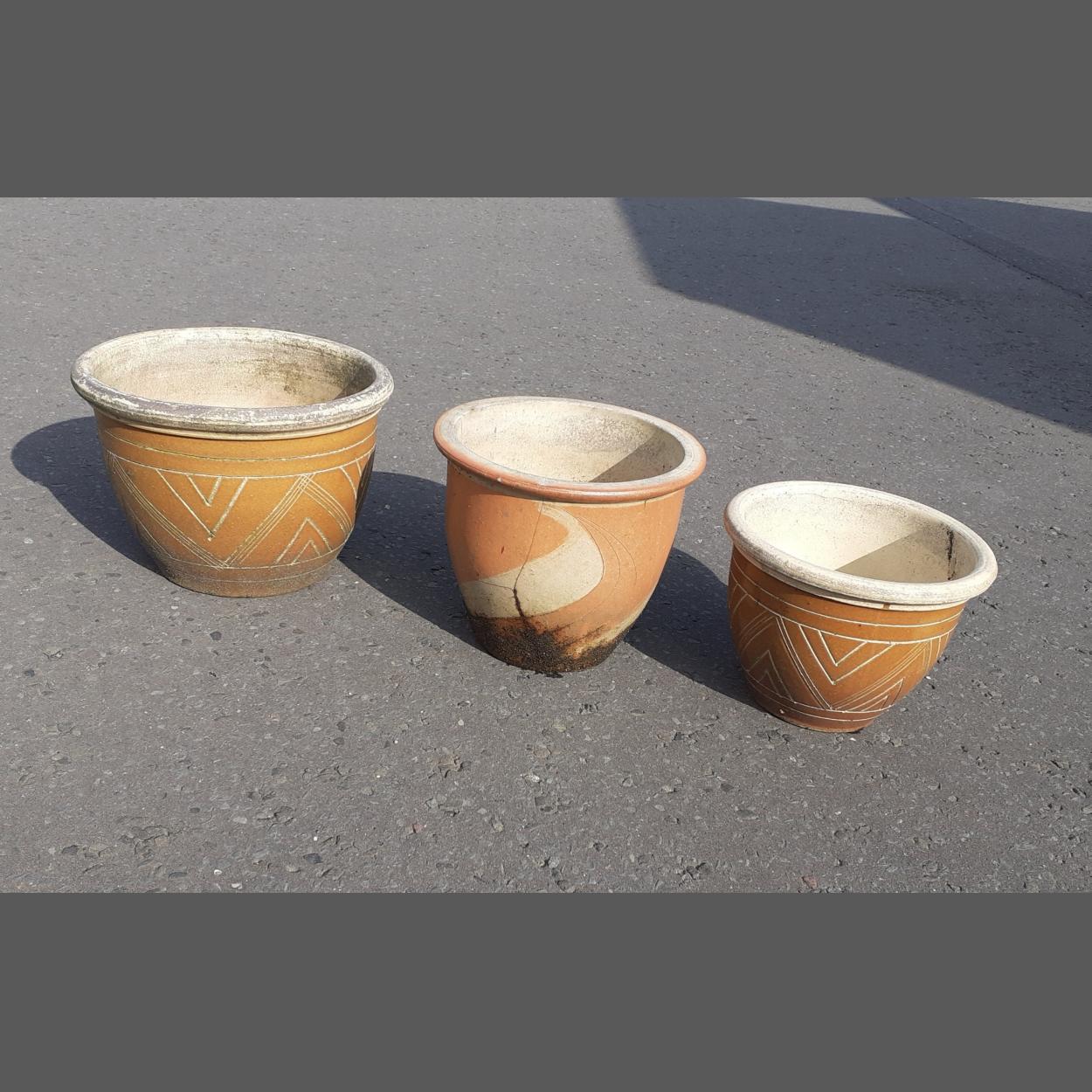 Three brown ceramic garden containers differing sizes - - tallest 28cm tall approx - IDEAL FOR AUTUMN PLANTING or in preparation for planting spring bulbs!