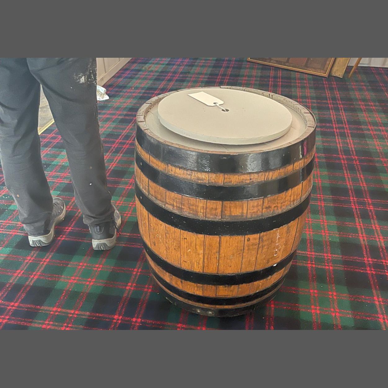 A large coopered oak barrel converted on castors with the intention to serve as fireside log barrel / 65cm height x diameter 55 cm aporox