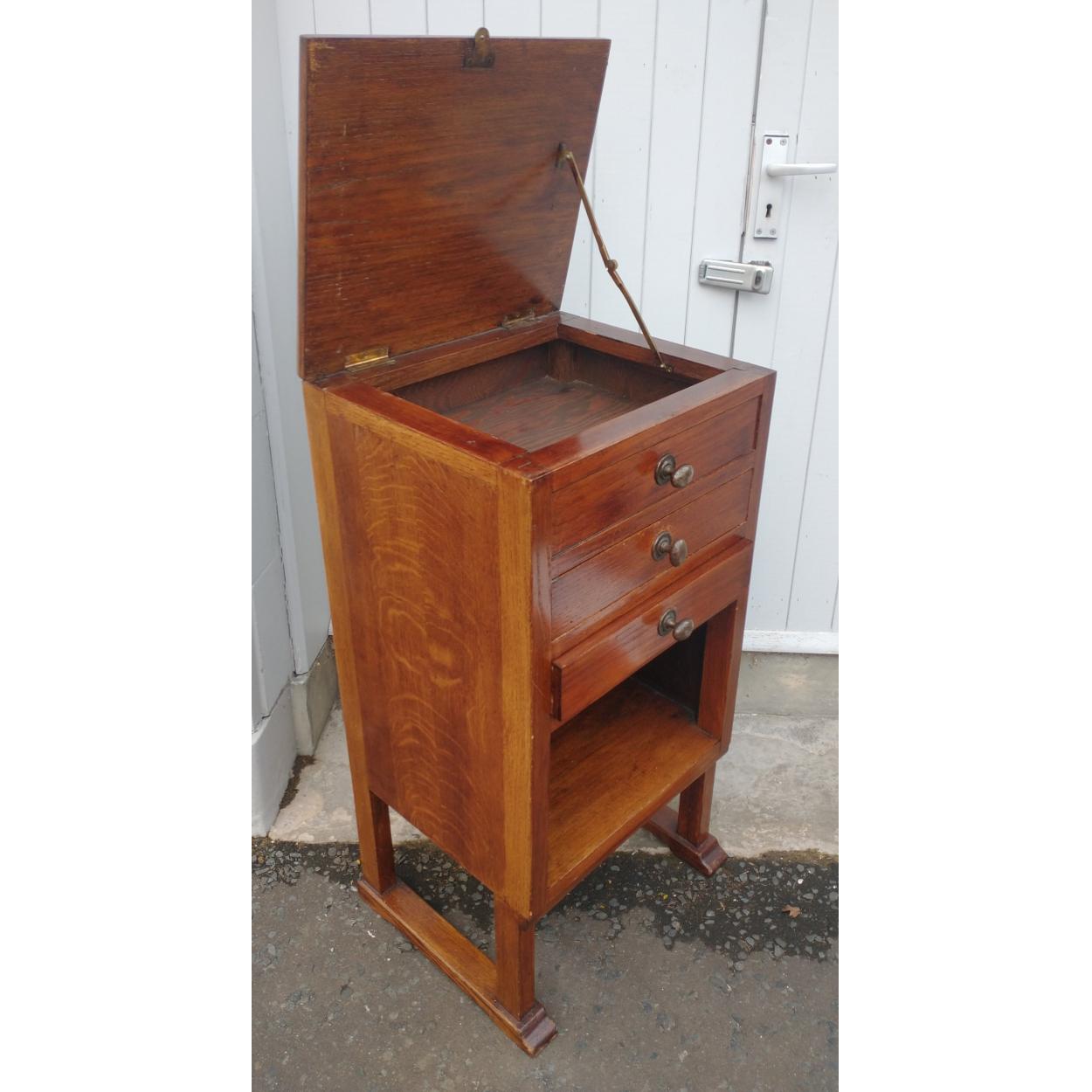 A useful wooden 2 drawer lidded storage cabinet in good condition. Perhaps contained an old gramophone ? 90 x 45 x 37 cm approx.