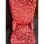 CLASSIC red upholstered chair and matching footstool. Recently recovered